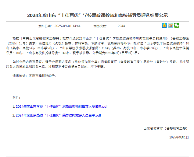 本次评选由山东省教育厅(省委教育工委)组织开展,经过各高校推荐、材料审核、专家评审、现场答辩等环节严格遴选,评选出“山东高校十佳辅导员”10名,“山东高校优秀辅导员”148名。