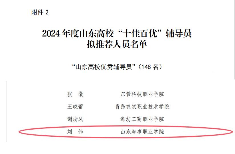 近日,中共山东省委教育工委公布了2024年度山东“十佳百优”高校辅导员评选结果,我校港航管理学院辅导员刘伟老师获评“山东高校优秀辅导员”。